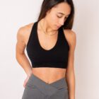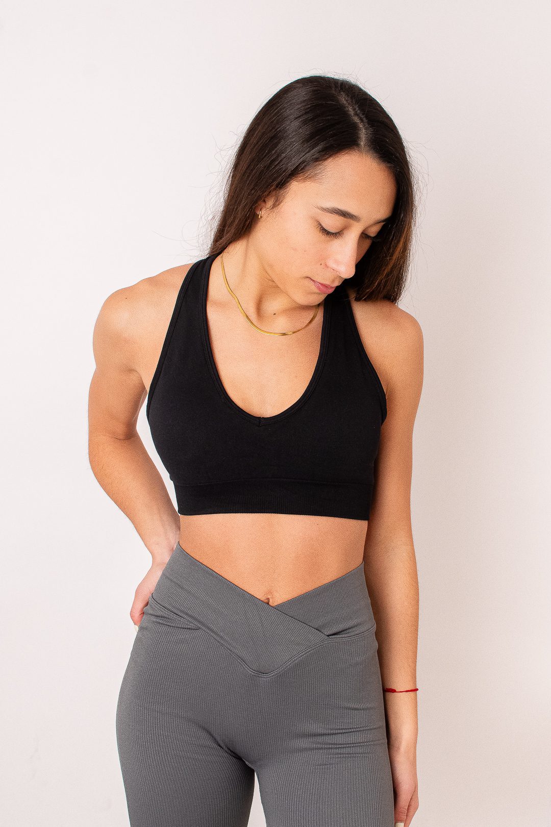 Largo: llega hasta debajo del busto, fit tipo “bra deportivo”.